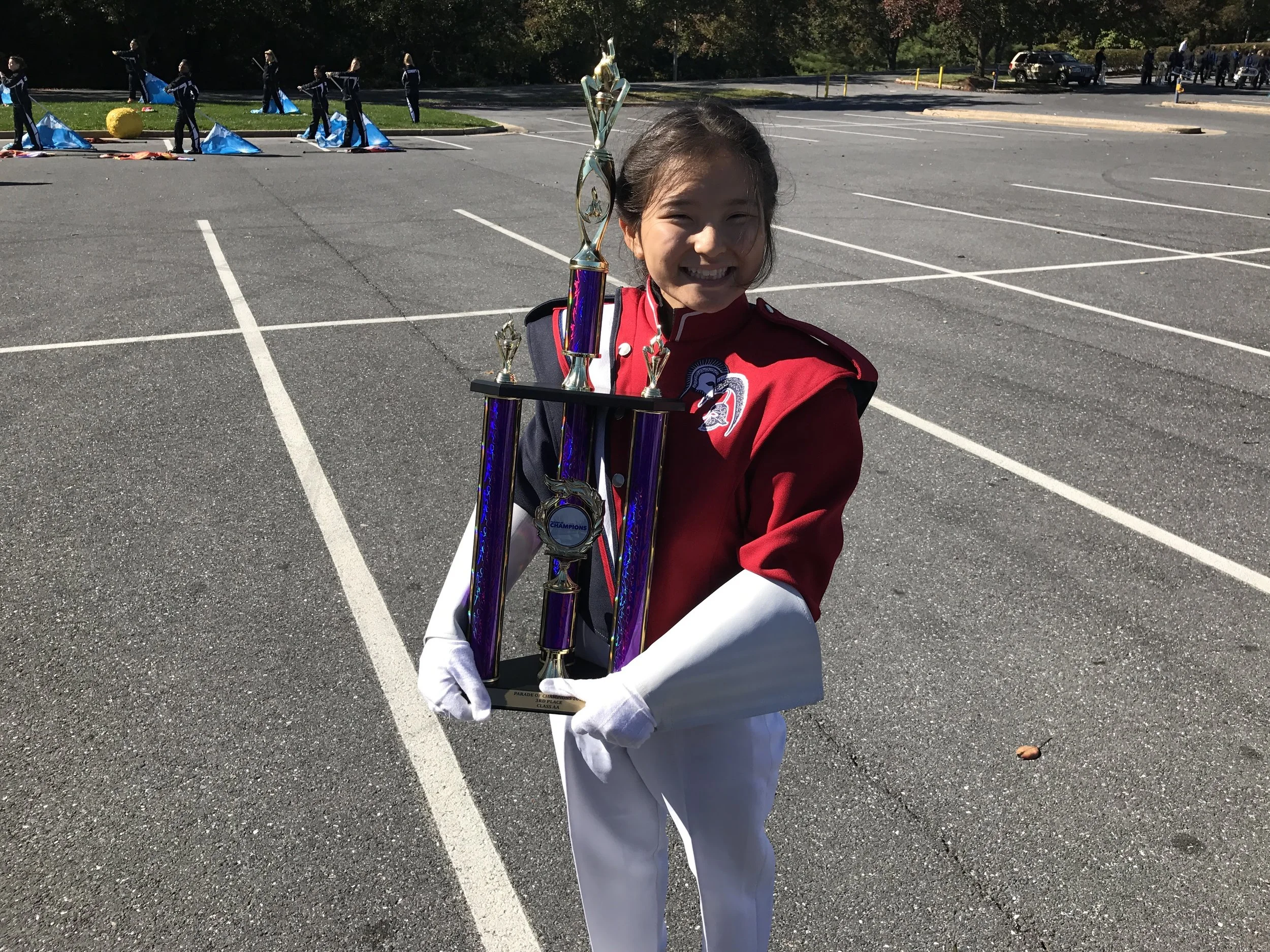 Drum Major Akie Kadota holds trophy after JMU's Parade of Champions 2016